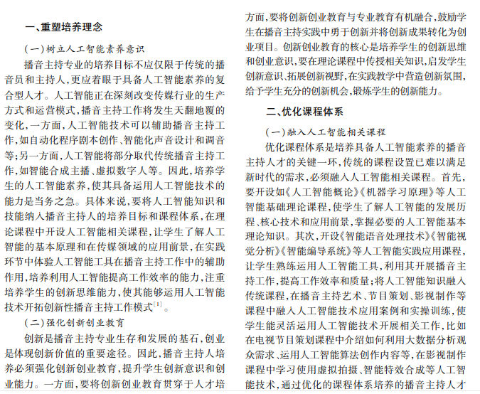 本文阐述播音主持人培养模式转型的五大策略,即重塑培养理念、优化课程体系、创新教学方法、 强化实践训练、加强产教融合,通过实施相关策略以培养具备人工智能素养和创新能力的新型播音主持人,满 足媒体融合背景下的播音行业发展需求。