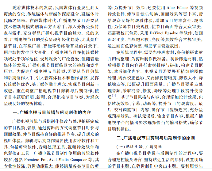在融媒体时代,广播电视节目的剪辑与制作需要创新,既要发挥新技术的优势作用,又要根据受众 的需求与审美调整。本文阐述广播电视节目剪辑与后期制作的内容与原则,分析融媒体对广播电视节目剪辑 与后期制作的积极和消极影响,提出融媒体视域下广播电视节目剪辑与后期制作的创新策略。