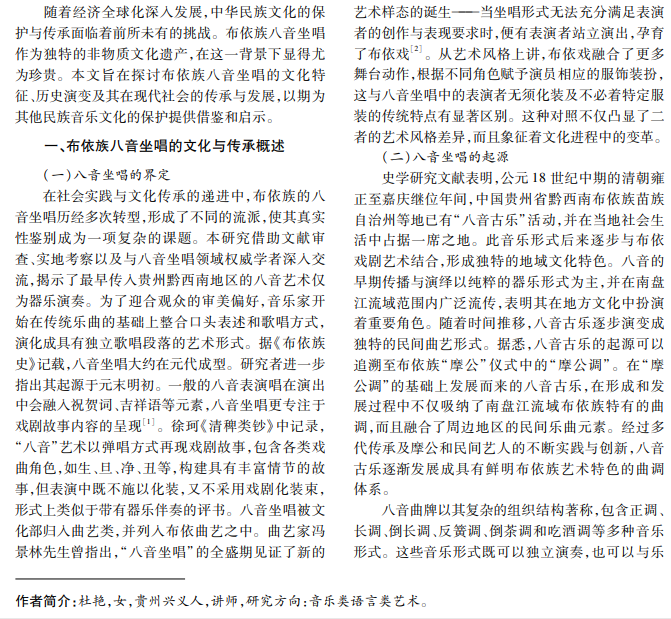 八音坐唱是布依族独特的音乐表演形式,其历史悠久,深受布依族人民的喜爱。本文通过文献回 顾等方法,系统分析八音坐唱的起源、发展、艺术特征及其在现代社会的传承与保护等。结果表明,八音坐唱不 仅是布依族文化的重要组成部分,而且是中国民族音乐文化宝库中的珍贵财富。面对现代化冲击,加强对八音 坐唱的保护与传承,对维护民族文化多样性具有重要意义。