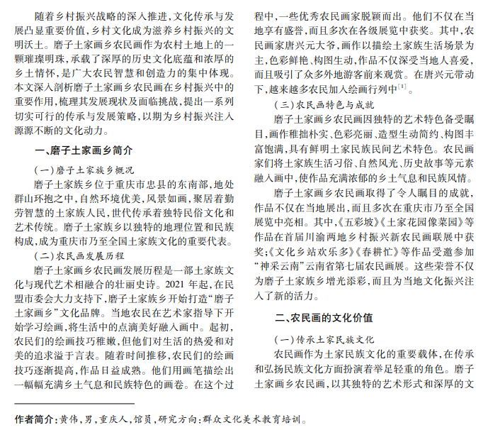 磨子土家画乡农民画是土家民族文化瑰宝。“乡村振兴,文化先行。”在乡村振兴大背景下,忠县磨 子土家画乡的农民画以独特的土家族民间艺术特色成为推动当地文化振兴的重要力量。本文剖析磨子土家画 乡农民画,探讨其文化价值、发展现状及面临挑战,探索文化产业赋能乡村振兴的新路径,并提出发展策略。
