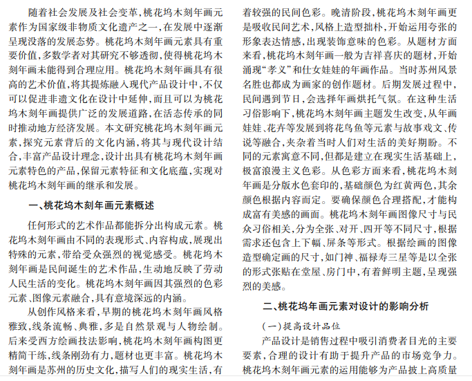 桃花坞年画作为四大年画之一,有独特的审美内涵与文化底蕴。基于桃花坞丰富的文化意蕴,应 充分探寻其蕴含的人文精神与美学思想,将木刻年画元素应用在商品设计中,为商品研发提供物质基础与创意 思想,实现传统艺术与现代设计融合,发挥桃花坞木刻年画元素的价值。