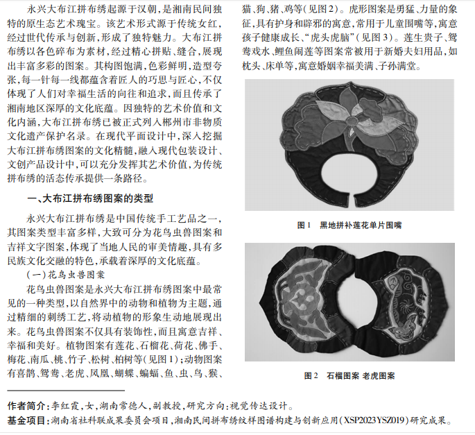 永兴大布江拼布绣是湘南民族文化的重要组成部分,有着深厚的文化底蕴和极高的艺术价值。本 文通过分析大布江拼布绣图案类型和文化内涵,探讨对大布江拼布绣图案展开再设计以及提炼色彩,创造出既 符合时代气息又具有民族文化内涵的视觉符号,应用于文创产品、包装设计中,为传统拼布绣文化的活态传承 提供新路径。