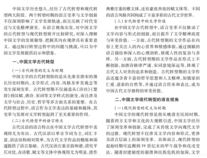 本文从语言视角出发,对中国文学的古代转型与现代转型展开比较研究,通过分析古代转型与现 代转型的语言特性、风格及文学价值,揭示两者在内容与形式、审美观念等方面的演变与差异。本文还探讨了 中国文学转型过程中的问题与挑战,提出相应策略与建议。