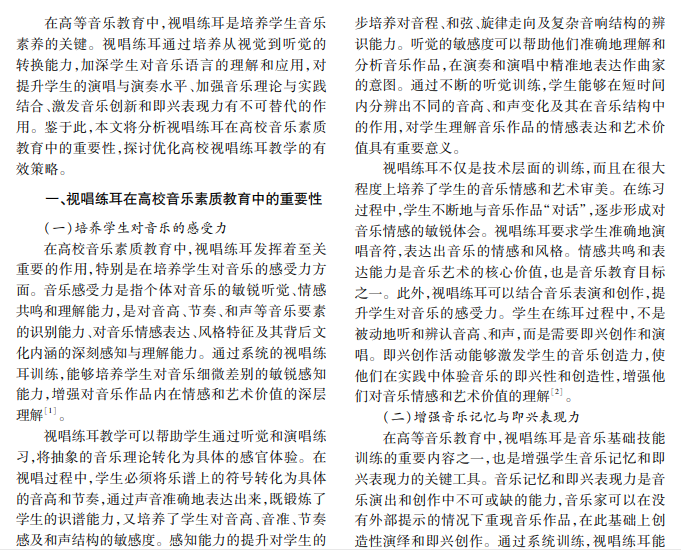 视唱练耳作为高校音乐素质教育的重要组成部分,对培养学生音乐综合能力具有重要意义。通过 视唱练耳系统训练,能够提升学生对音乐的感受力,增强音乐记忆与即兴表现力,提升创新能力。本文探讨视 唱练耳在高校音乐教育中的重要性,提出针对性教学优化措施,旨在提高教学效果,满足不同学生的学习需求。