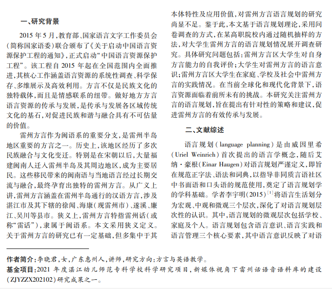 在国家“语保工程”背景下,雷州方言作为粤西地区重要的方言之一,调查雷州方言区大学生方言 实践情况对地方政府制定语言政策与语言规划具有重要意义,可以促进雷州方言的有效传承与发展。本文基 于语言规划理论,采用问卷调查的方式,在某高职院校内通过随机抽样的方法,对大学生雷州方言实践情况展 开调查研究。