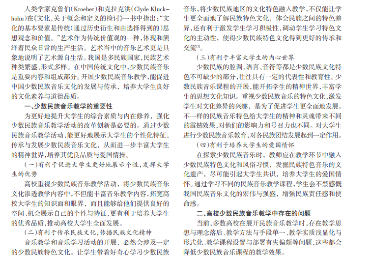 在中华民族优秀传统文化传承中,民族音乐文化传承占据很大一部分。然而,随着社会的不断发展,年轻 人的文化传承素养被现代快消社会侵蚀占据,文化传承的主力军仍是中老年一代。推进文化素养养成,加强少数民族 音乐课程的教学,能够促进少数民族文化得到传承和延伸,使得高校少数民族的音乐教学课题活动得以顺利地开展。 本文分析了高校少数民族音乐教学开展的现状及重要性,并提出少数民族音乐教学策略,以提高高校少数民族音乐教 学能力和水平。