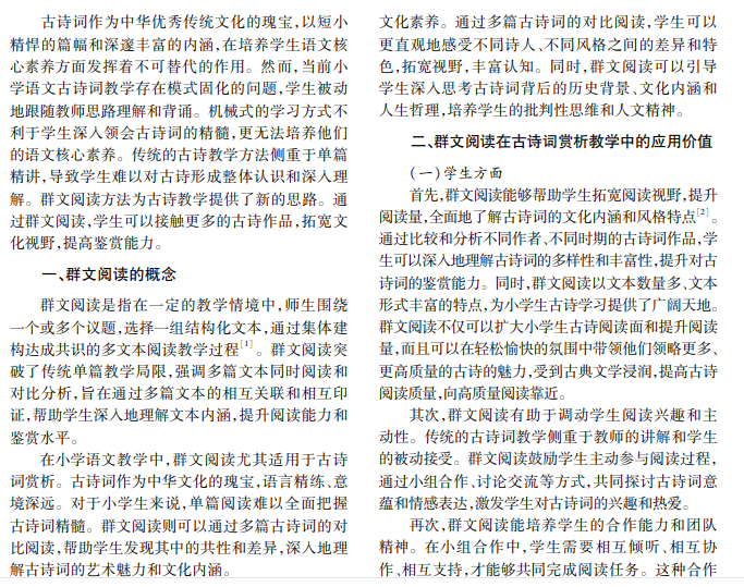 古诗词作为中华文化的瑰宝,不仅承载着丰富的历史信息,而且是中华优秀传统文化精髓的凝结。 诗性文化对小学生语文核心素养的培养有不可替代的作用。近年来,随着教育改革不断深入,群文阅读作为新 兴教学方法逐渐受到教育工作者的关注和重视。本文从小学语文古诗词教学现状出发,探讨古诗词鉴赏中群 文阅读的实施方法,以期为提高小学生古诗词鉴赏能力和文化素养提供有益参考。