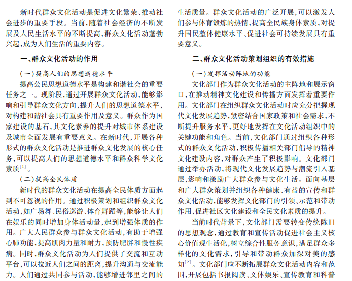 当前时代背景下,科学合理地策划与组织群众文化活动,满足不同群体的文化生活需求,提升群众 文化活动质量,成为群众文化部门必须认真研究的工作。本文分析和探究新时代群众文化活动的策划与组织, 探讨有效的实践路径与方法,旨在为群众文化事业发展提供参考。