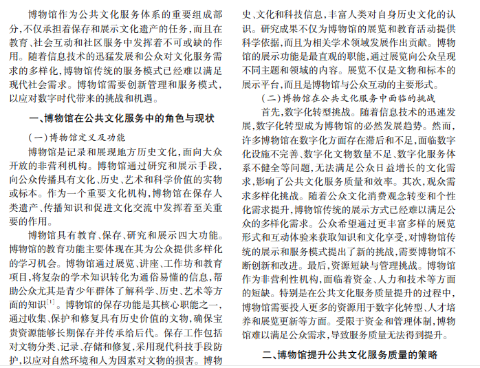 博物馆作为现代公共文化服务体系的重要组成部分,承担着传播知识、保存文化遗产和促进社会 文化发展的任务。随着社会的不断发展和公众文化需求的变化,博物馆在提供公共文化服务时面临诸多挑战。 本文通过分析博物馆在公共文化服务中的角色和现状,分析博物馆在现代公共文化服务中的价值,并提出提升 公共文化服务质量的策略。