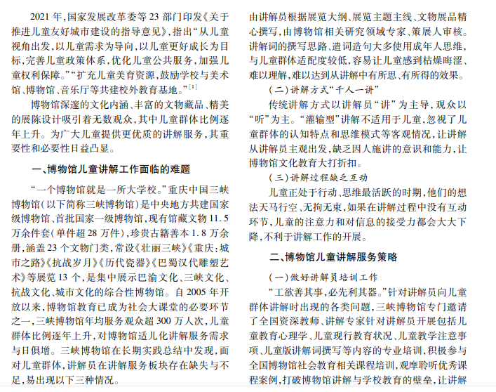 博物馆作为儿童教育的重要场所,应为广大儿童提供符合其需求的讲解服务。目前博物馆针对儿 童的讲解内容、讲解形式、讲解方法都有待完善。本文以重庆中国三峡博物馆为例,浅谈新时代博物馆如何做 好儿童讲解传播工作,以促进博物馆文化教育多元发展。