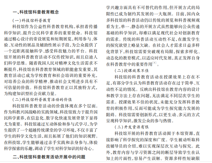 科技馆作为公共文化的重要组成部分,承载着组织科学宣传教育、展示科技文化成果、丰富公众精 神文化生活、培育科学精神、提升公民素质的重要职能。随着社会发展,加强科普教育工作,创新科普教育形 式,激活科普资源潜能,推动科普教育资源开发共享,已成为科普教育战线的重点任务。本文探讨如何优化科 普教育方式,让科普教育更多更好地惠及人民,促进人的全面发展。