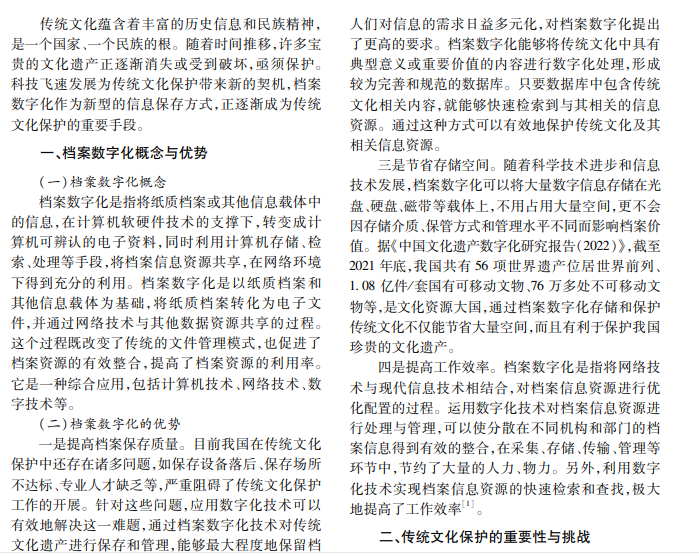 随着信息技术快速发展,文化遗产数字化保护已成为主要趋势。本文从档案数字化和传统文化保 护的互动关系入手,分析档案数字化在传统文化保护中的优势,就如何促进二者协调发展提出建议,希望能为 我国文化遗产保护工作提供借鉴和参考。