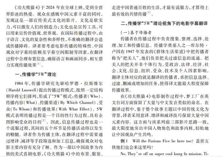 《功夫熊猫 4》以鲜活的动画形象、丰富的中国元素及幽默的语言风格吸引了中国观众。《功夫熊 猫》系列电影以美国视角叙述中国故事,借助中美合拍电影“借船出海”讲述中国故事,传播中国文化,通过电影 让世界了解中国,为跨文化传播提供了很好的案例。字幕翻译质量决定电影传播度,本文从传播学 5W视角,对 《功夫熊猫 4》字幕翻译技巧展开评价分析,为中国电影字幕翻译质量提升、中国电影走出国门提供借鉴。