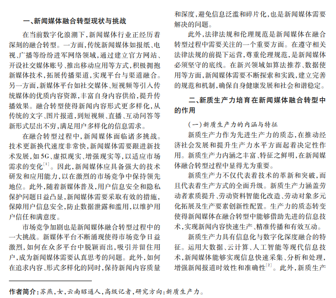 新闻媒体在融合转型中需培育新质生产力、提升新闻传播力。本文分析新闻媒体融合转型现状、 挑战及新质生产力内涵与特征,探究新闻传播力构成与提升策略,探讨新质生产力和新闻传播力的互动关系, 旨在为新闻媒体转型提供理论支持和实践指导,以应对信息技术发展带来的挑战。