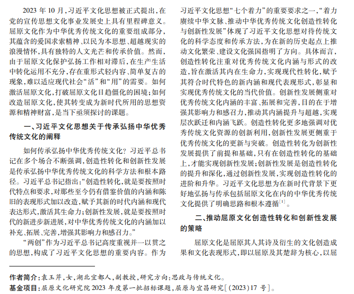 激活、改造屈原文化,使其融入日常生活,实现创造性转化、创新性发展,是当前值得关注与思考的 问题。本文以习近平文化思想为理论遵循,基于宜昌市推动屈原文化“两创”实践为例,从强化顶层设计、促进 日常实践、建立制度保障、优化环境支持四个方面提出屈原文化创造性转化和创新性发展策略,力求为当下促 进屈原文化创造性转化和创新性发展提供有益的探索与方法借鉴。