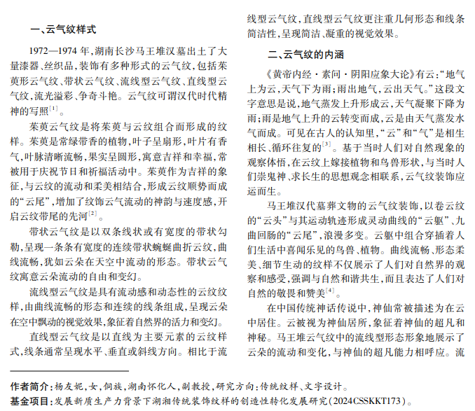 在长沙马王堆出土的西汉时期文物中,云气纹是常见纹样,形式包括茱萸云气纹、带状云气纹、流 线型云气纹、直线型云气纹,具有独特的美感和艺术价值。本文追溯不同形态云气纹的样式及内涵,并将其运 用于葡萄牙巴卡乐酒业的酒标设计中。通过中西合璧的设计寻求跨越时空的文化认同,探索在全球化背景下 将文明互鉴模式应用于艺术设计领域。
