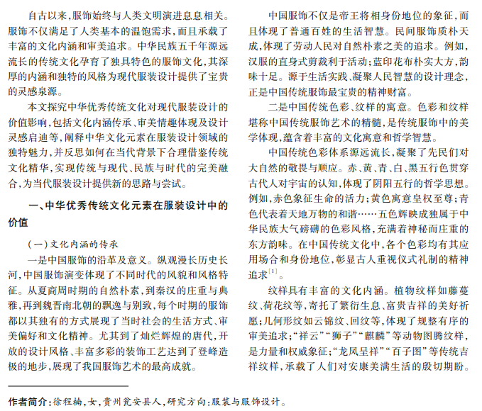 中华五千年的文化积淀孕育了独特的服饰文化,其深厚内涵和独特风格为现代服装设计提供了丰 富的灵感源泉。本文通过分析中国服饰的沿革、色彩与纹样寓意、审美情趣体现,以及背后的传统哲学思想与 古典文学艺术内涵,阐释中华文化元素在服装设计领域的独特魅力,思考如何在当代背景下合理汲取传统文化 精华,实现传统与现代、民族与时代的完美融合,为当代服装设计提供新的思路与方法。