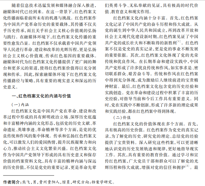 随着信息技术快速发展,融媒体时代已经到来。融媒体环境下,形成了多元化的信息传播渠道和 方式。红色档案文化作为中华民族的重要精神财富,其传播与弘扬尤为重要。本文从多个角度探讨融媒体环 境下红色档案文化传播的机遇与挑战,提出传播策略和建议,旨在更好地传承和发扬红色文化,提升民族凝聚 力,增强文化自信。