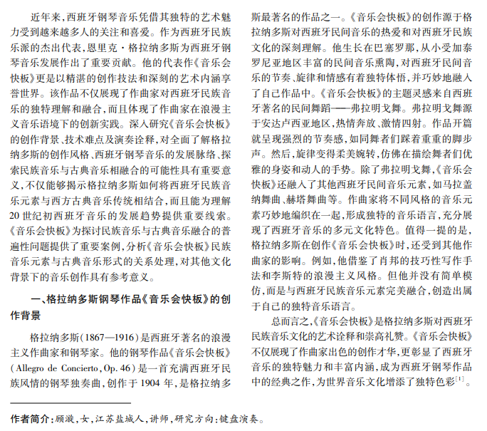 为深入了解格拉纳多斯钢琴作品《音乐会快板》的演奏技巧和艺术诠释,本文从音乐主题的流动 性、乐句之间的划分与连接、和声色彩的体现及整体情感表达等方面展开全面分析,通过乐谱解读和技术难点 剖析,揭示该作品蕴含的西班牙民族音乐元素,并提出相应的演奏建议。