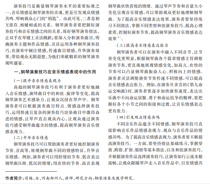 钢琴演奏技巧与音乐情感表现相辅相成,精湛的演奏技巧可以更好地诠释作品,引发观众情感共 鸣,提高钢琴演奏效果。钢琴演奏者要对演奏曲目了如指掌,精准把握作品蕴含的情感,将演奏技巧和情感表 现融为一体,将自己对作品的理解融入演奏中,为钢琴演奏注入灵魂,提高钢琴演奏水平。