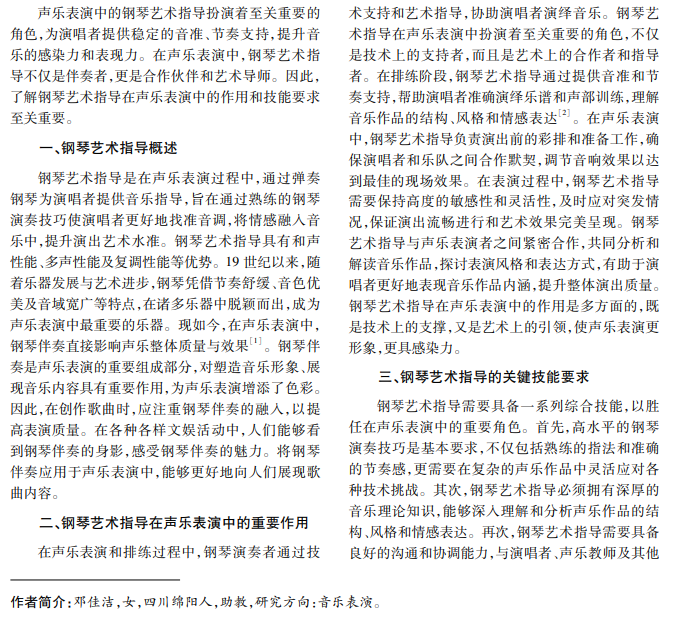 在声乐表演中,钢琴艺术指导扮演着重要角色,不仅提供音乐伴奏,而且能为演唱者提供指导和支 持,需具备深厚的音乐素养和丰富的演奏经验。本文以钢琴艺术指导为切入点,分析钢琴艺术指导在声乐表演 中的重要作用,阐述钢琴艺术指导在声乐表演中的关键技能要求,探讨如何利用现代技术和创新手段提升声乐 表演质量和效果,以期为钢琴艺术指导人员提供参考。