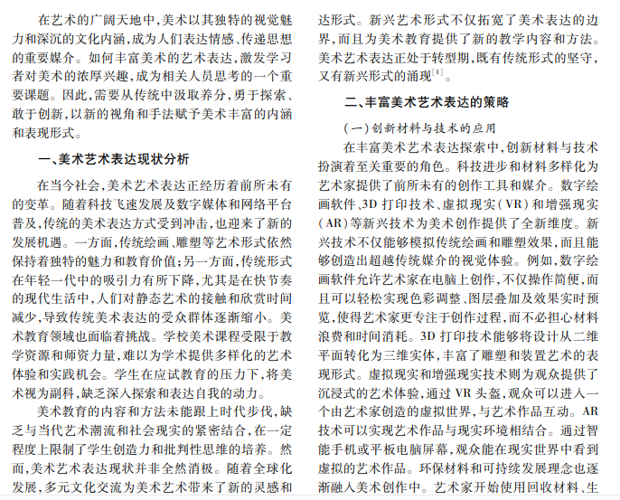 在多元化社会背景下,美术艺术作为重要的文化表达形式,不仅承载着审美与情感的传递,而且是 个体与社会交流的桥梁。随着时代发展,传统的美术表达方式已难以满足现代人的审美需求,美术教育也面临 着如何激发学生学习兴趣的挑战。