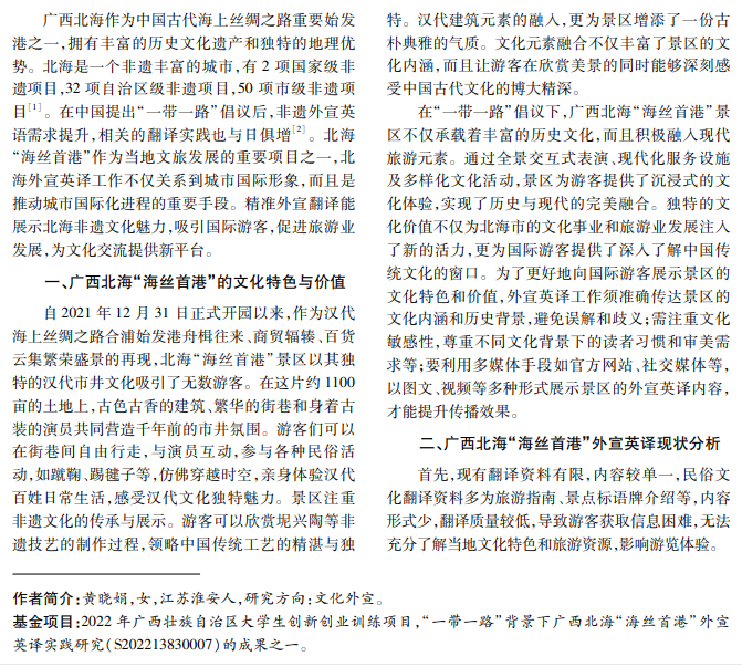 本文研究“一带一路”背景下广西北海“海丝首港”外宣英译实践,概述北海作为海上丝绸之路重要 始发港之一的地位,分析其外宣英译现状和挑战,并提出相应改进措施。旨在提升外宣英译质量,展示北海非 遗文化魅力,吸引国际游客,推动旅游业发展,促进文化交流。