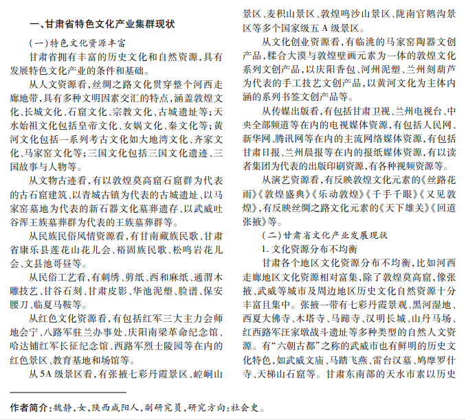 甘肃省具有优质的特色文化产业资源,为产业化发展提供了良好的基础。目前,甘肃特色文化产 业发展存在地区间文化资源分布不均衡、产业发展程度差异性大、文化基础设施建设不足、产业链不完整、文创 人才缺乏、投入不够等问题,对此,应从构建文化产业空间集群区、完善产业协同发展机制、促进区域资源整合 利用、打造特色区域文化品牌、优化文化产业发展环境、提升园区基础配套建设、发挥示范园区辐射带动等方面 推进特色文化产业集群化发展。
