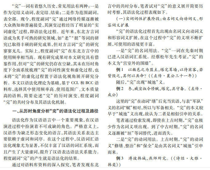 “完”在东北方言中常作为程度副词使用,用于构成“V/A完了”粘合式述补结构和“V得完完的” 组合式述补结构。本文调研大量相关语料,从历时角度分析“完”的词性用法,研究“完”的虚化演变过程,重点 讨论程度副词“完”在语义、句法、语用三个方面的语法化机制,以对东北方言词“完”和方言语法化有深入了解。