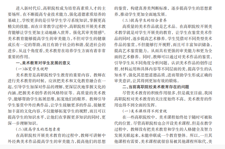 随着国家对职业教育关注度的进一步提升,职业教育在整个教育系统中所占的比例不断增加,所培养的 学生对社会的贡献也有所提高。当前,高职院校在美术教育中存在一定的问题,如果不能及时解决,势必会影响人才综 合素质的提高。所以,本文针对高职院校美术教育中存在的问题提出改进策略,以期为高职院校培养更优秀的人才提供 一定的建议。