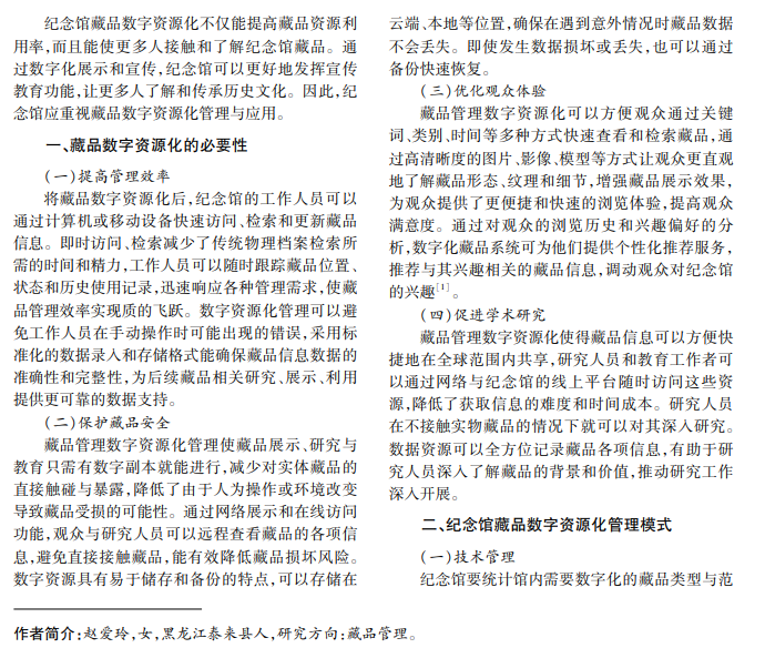 传统的档案管理方式难以满足纪念馆藏品管理需求,数字化技术应用能有效解决传统档案管理的 不足。基于此,本文介绍藏品管理数字资源化的必要性,藏品数字资源化在技术、内容、安全等方面的管理模 式,以及数字化展示、互动体验、在线查询、3D文物应用、数字资产管理、智慧化服务、学术研究、文创产品等数字 资源应用方式。
