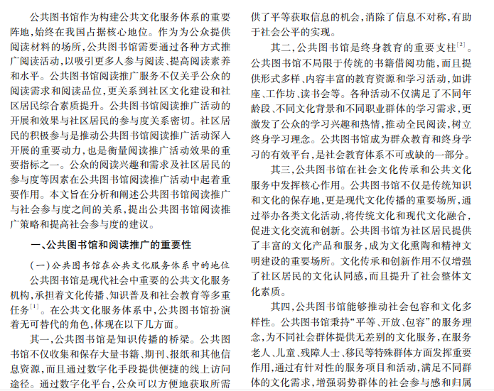 公共图书馆是公共文化服务体系的重要组成部分,阅读推广是图书馆的核心职能之一。本文通过 探索公共图书馆阅读推广活动与社会参与度的关系发现,公共图书馆开展阅读推广活动可以调动公众的阅读 兴趣,提升阅读水平,提高公众对图书馆的使用率和满意度。
