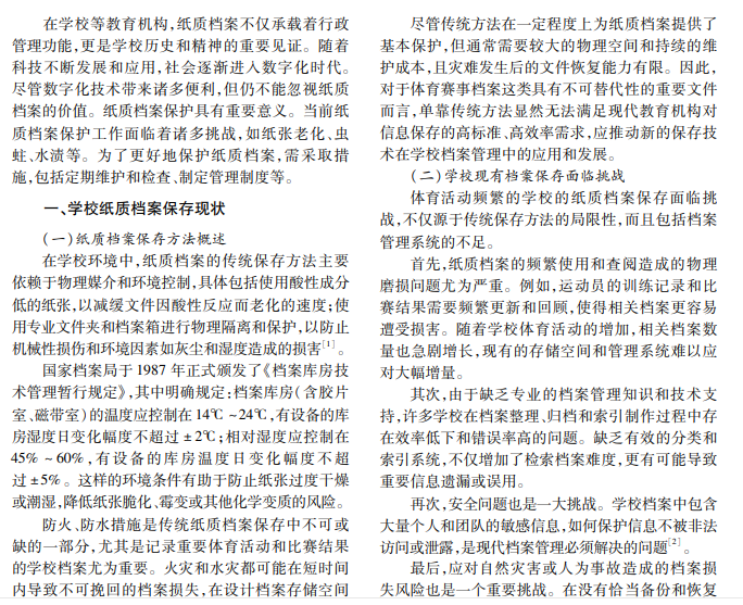 本文探讨学校纸质档案长期保存现状与发展趋势,分析环境控制、物理和化学保护及档案恢复技 术的最新进展,以及如何通过精确调控温湿度、使用先进材料和技术增强档案稳定性,探讨化学处理和光学技 术在恢复受损档案中的应用。通过技术融合,可以显著提高档案保存质量,确保资料长期安全与完整性。