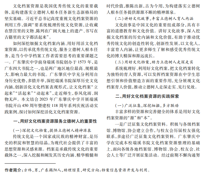 文化档案资源在中小学构建落实立德树人根本任务新生态新格局中发挥着重要作用,然而当前学 校对文化档案资源的开发利用普遍存在挖掘深度浅、宣传力度弱、表现形式单一等共性问题。本文结合广东肇 庆中学挖掘活化其前身端溪书院文化档案资源、策划开展端溪书院开山 450周年暨建校 118周年系列庆祝活动 实践案例,从挖掘文化内涵、加强宣传推广、创新表现形式等维度开展思考探索。
