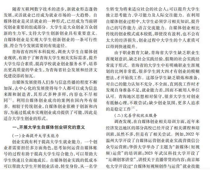 大学生是大众创业万众创新的生力军,自媒体创业是实现大学生创新创业的一条可行性强、符合 当今发展需要的有效途径。为响应国家创新创业号召,提高高校就业服务水平,提升学生就业能力,应鼓励大 学生开展创业活动,营造良好的自媒体创业氛围和创业环境,助力青海省社会和经济发展。