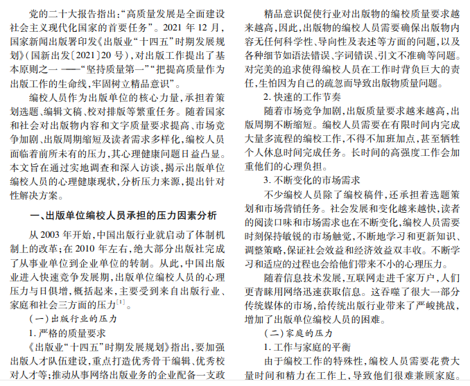 出版业编校人员心理健康状况直接影响出版物质量。本文基于出版单位编校人员的实际工作感 受,深入探讨其心理健康现状,分析来自出版行业、家庭和社会的压力因素,并提出可行性解决方案,以期促进 编校人员心理健康与出版业可持续发展。