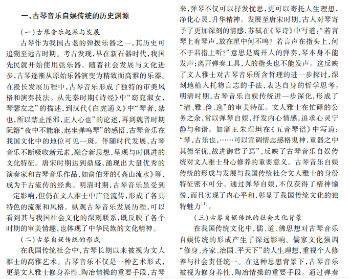 本文从生态美学视角出发,探讨古琴音乐自娱传统的历史渊源、生态美学特征及当代价值与传承, 通过分析其与自然环境、审美追求、心灵净化等方面的关系,阐明独特的生态美学内涵。同时,本文探讨古琴音 乐自娱传统对现代人的启示及其在当代社会中传承与创新的意义。