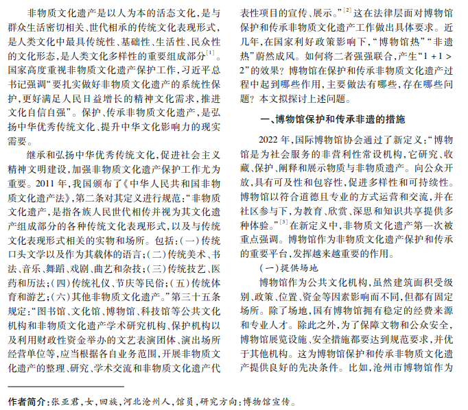 近年来,我国日益重视非物质文化遗产保护,不断推进非物质文化遗产保护工作。博物馆在保护 和传承非物质文化遗产方面发挥重要作用。本文以沧州市博物馆为例,分析其保护与传承非遗的主要做法、存 在问题和解决路径,旨在为开展博物馆保护和传承非物质文化遗产工作提供思路。