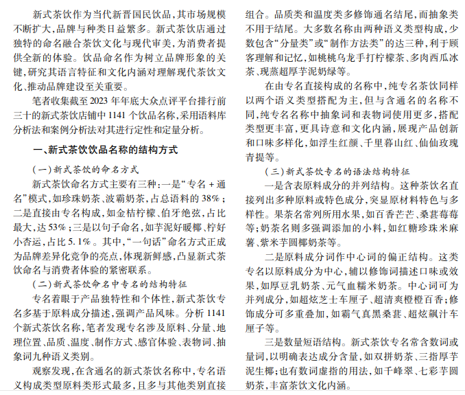 随着新式茶饮市场规模扩大,新式茶饮命名逐渐展现独特的语言特色与文化意蕴。新式茶饮名称 以原料为核心,语义搭配类型多样,专名地位突出。其在语法结构上有五种基本类型,常见偏正和并列结构;在 语音特征方面,音节数量跨度大,以四到七音节为主,广泛运用叠音和谐音手法,融合传统茶文化与现代潮流, 同时,展现鲜明的创新性与时代特色。