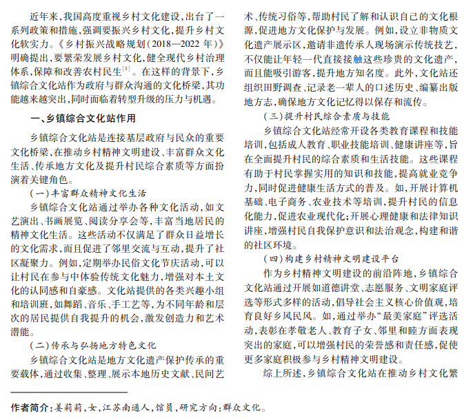 乡镇综合文化站担负着丰富群众文化生活、传承地方文化、提高群众文化素质的重要任务。在乡 村振兴背景下,目前乡镇综合文化站在开展群众文化活动方面还存在许多问题,很难满足广大群众日益多样 化、个性化的文化需要。本文主要探索乡镇综合文化站开展群众文化活动的创新途径。