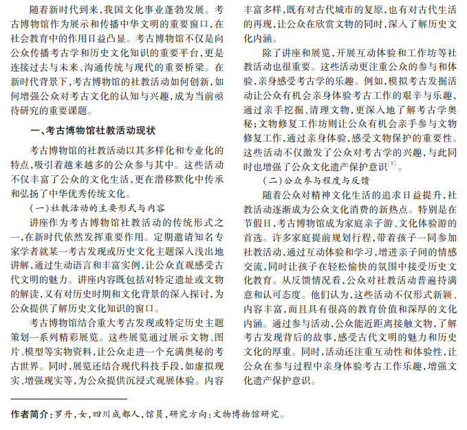 本文探讨新时代考古博物馆如何创新发展社教活动以加深公众对文化遗产的理解。利用数字化 技术、互动体验活动等创新展览方式,可以让公众更直观、生动地了解考古遗址和文物;同时,与学校合作、开发 文创产品等可以提升活动影响力,提高公众参与度。这些策略的实施有助于保护和传承文化遗产,满足公众对 历史知识的需求。