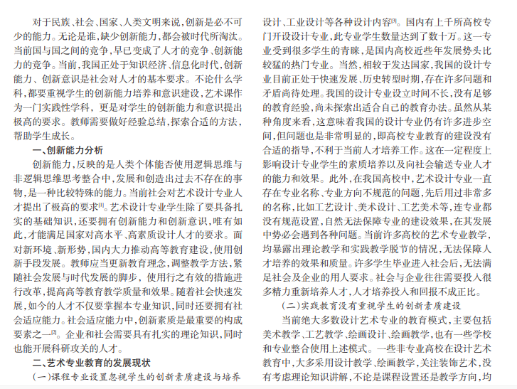 作为一门有极强实践性的课程,设计艺术学课程已经成为当前素质教育环境中极具代表性与艺术价值的 课程。在此课程教学中,传统的教学方法和教育观念渐渐无法满足当前学生的需要。在这样的背景下,设计艺术学需要 改革教学模式与教学思路。学科教育中,应将针对课程设计作为出发点,探索适应性强的教育模式,体现学科教育的连 续性、专业性价值。随着社会的不断发展进步,设计艺术专业的学生,必须具备更出色的创新能力和创新意识,才能迎 接未来的生活与工作。所有艺术专业的教师,都要注意该问题。本文以此为基础,分析创新能力代表了什么,以当前高 校的艺术专业学生现状为例,分析培养其创新能力的意义与方法。