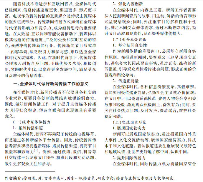 随着科技飞速发展,全媒体时代悄然来临,为电视新闻主持工作带来了前所未有的挑战。在此背 景下,不仅要应对信息碎片化的挑战,而且要在多元媒体环境中保持专业性和影响力。本文深入探究全媒体时 代传统新闻传播行业面临的挑战,并提出做好工作的措施,旨在为相关从业人员提供借鉴,以适应全媒体时代 发展需求。