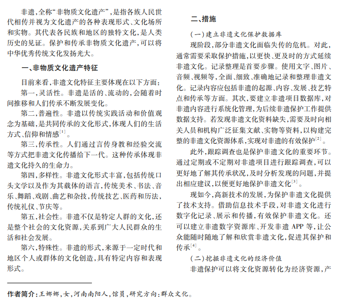 非物质文化遗产既是人类文明的结晶和宝贵的财富,也是传统文化中最富活力的部分,它承载人 类历史的文明与辉煌,在文化领域中占据重要地位。本文论述非物质文化遗产在现代社会的传承与发展,希望 为非遗文化发展贡献力量。