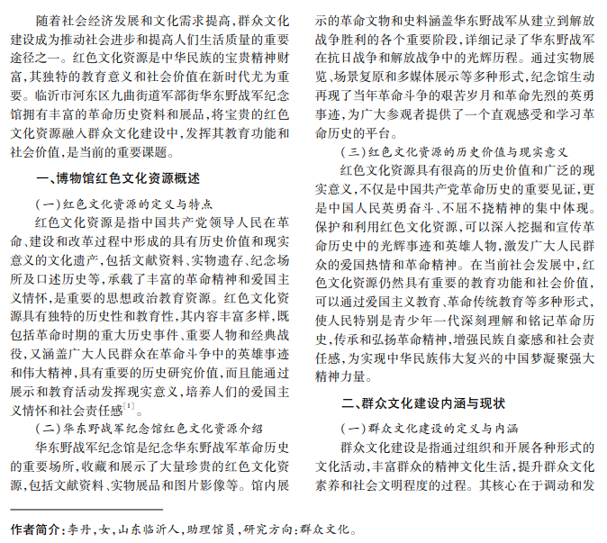 博物馆作为保存、展示和传播历史文化的重要机构,在社会文化建设中发挥着重要作用。尤其是红 色文化资源作为革命历史和爱国主义精神的载体,对群众文化建设具有独特价值。临沂市河东区九曲街道军部 街华东野战军纪念馆,积累了丰富的革命历史资料和展品,是开展爱国主义教育和革命传统教育的重要阵地。