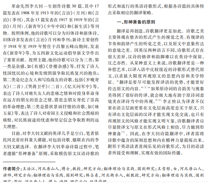在翻译李大钊诗歌及楹联过程中,译者应遵循“形神兼备”以诗译诗的原则,在形式上,采取模拟英 语诗歌的方法,以“归化”策略为主;在翻译方法上,采取直译和意译相结合、调整结构、文内注释、保留意象等方 法,以求准确传达原文思想内容,再现原文神韵。