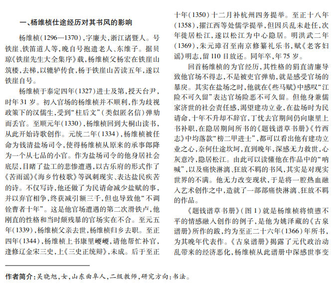 元代书坛以赵孟瞓及其倡导的复古书风为主流,主张“宗唐溯晋”的复古观念,在元代前、中期迅速 发展,书坛书风雷同。到元末,由于社会动荡不安,书家避世隐居、雅集活动盛行,群体书法交流增多,元末江南 书坛的书家将个体意识带入书法创作并发挥到极致,使得元末书坛呈现多元发展。杨维桢的书法颠覆传统,本 文结合他的诗学主张、时仕时隐的仕途经历、在玉山雅集中与文士的书画交游活动等,分析他对复古书风的突 破及后世影响。