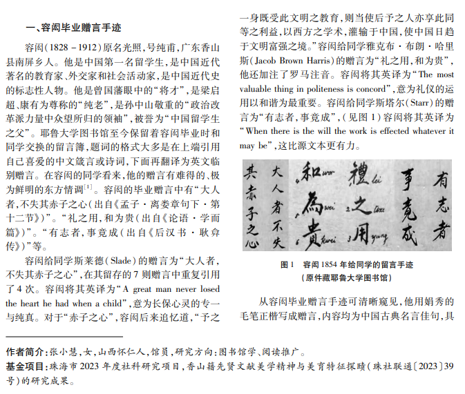 本文通过梳理容闳毕业赠言手迹、蔡廷干《唐诗英韵》、王云五《四角号码检字法》、郑观应《罗浮 耂鹤山人诗草》等文献,择取广东香山籍先贤文献在美学精神与美育特征中的优秀实践,采撷其中思想精华。 从文献分析的视角来看,香山籍先贤文献具有鲜明的民族性,洋溢着强烈的时代性,俨然成为新时代传承和 弘扬中华美学美育精神的有力阵地,对研究提高“人文湾区”香山文化美学美育度具有特殊的学术价值,值得 关注。