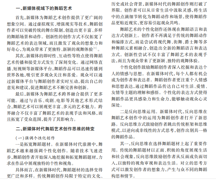 在信息时代的今天,舞蹈创作需与时俱进,利用新媒体创新舞蹈表现形式。新媒体为舞蹈艺术提 供广阔的想象空间,提高舞蹈作品表现力,为现代舞蹈创作提供更多可能。深入研究新媒体视域下舞蹈创作思 维,对舞蹈工作者的创作有重要的现实意义。