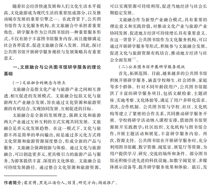 本文针对文旅融合背景下公共图书馆开展研学服务的现状及发展策略展开研究,介绍文旅融合概 念及其在当今社会发展中的重要意义,阐述公共图书馆在文旅融合中的地位、作用及研学服务现状,分析存在 的问题并提出策略。